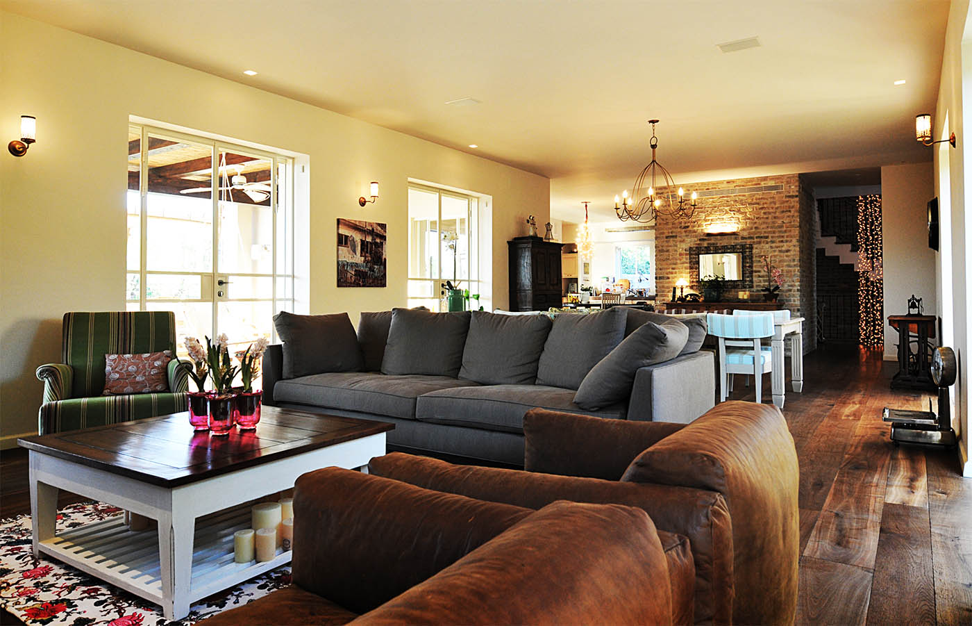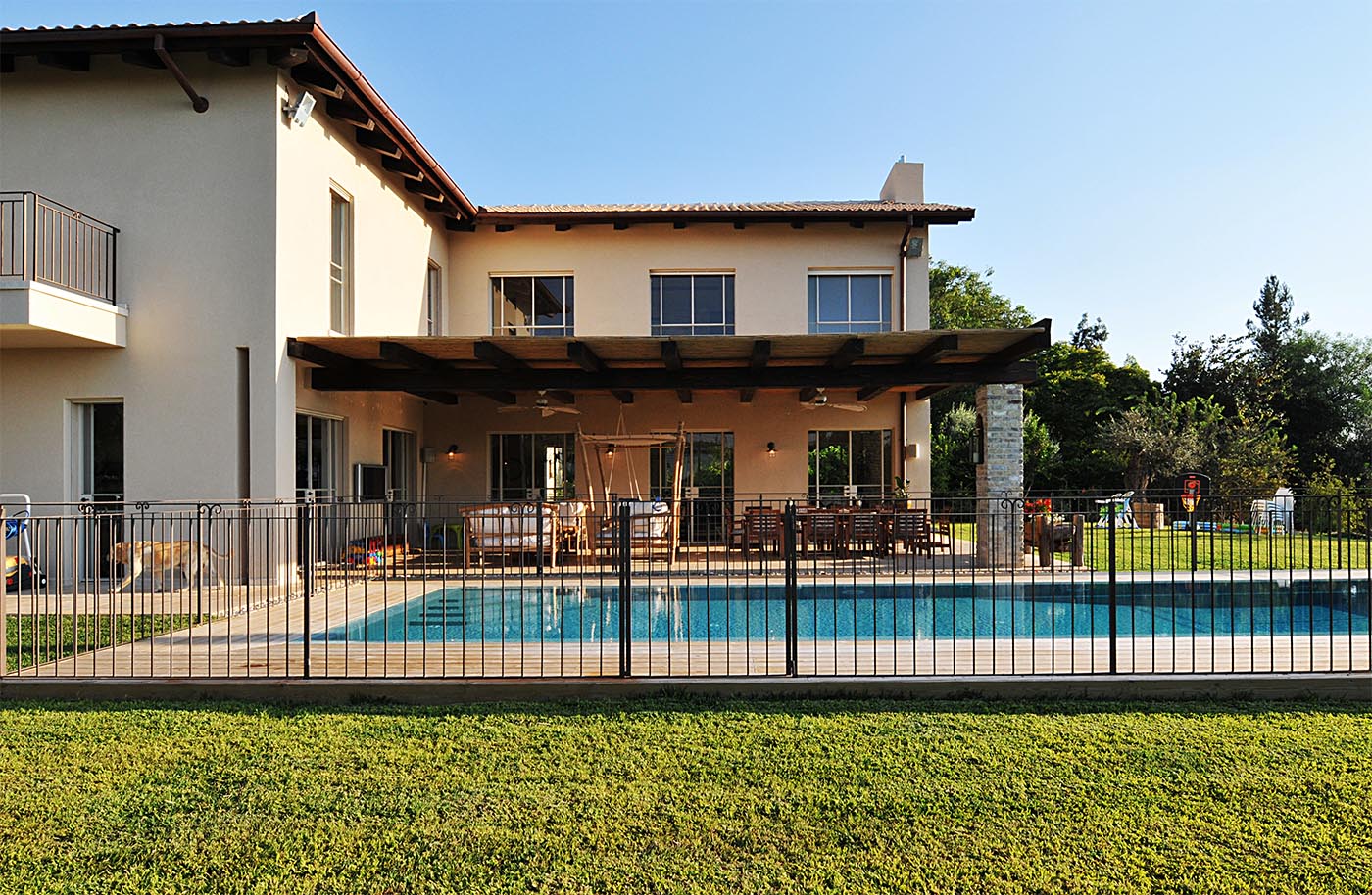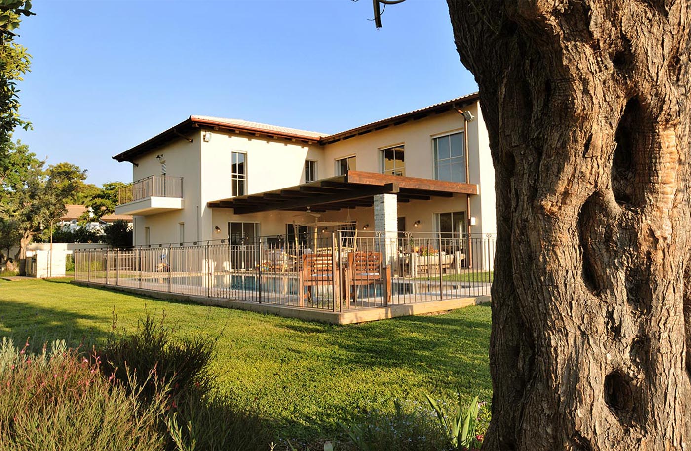 בית בשכונה הוותיקה של מכבים. השכונה מאופיינת בבתים צמודי קרקע, בעלי אופי די אחיד מאופק עם גגות רעפים. רצון הלקוח היה בית כפרי עם סממנים מאפיינים של רצפת עץ, לבנים ורהוט מסוגנן. כל זאת כדי ליצור תחושה של בית חם ולא פתוח מידי לסביבה. הבית עוטף רחבה חיצונית מקורה בפרגולה וצופה לבריכת שחיה המשמשת לפעילות חברתית ענפה (בית